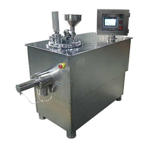 本機用于制藥工業(yè)中的固體制劑生產(chǎn),集傳統(tǒng)制粒工藝中的混合和制粒兩道工序與一體同時進(jìn)行,其制粒過程是先把粉料投入料筒內(nèi)經(jīng)攪拌漿形成翻滾狀態(tài),使不同性質(zhì)的粉料得到徹底的混合,然后逐量加入粘合劑。(通過攪拌漿和筒壁對物料的擠壓、揉合,使其形成潮濕均勻的軟材,同時經(jīng)制粒刀片的高速切割,逐步形成大小均勻的顆粒,最后由出料口排出,顆粒目數(shù)的大小由制粒刀的轉(zhuǎn)速和制粒時間控制)。